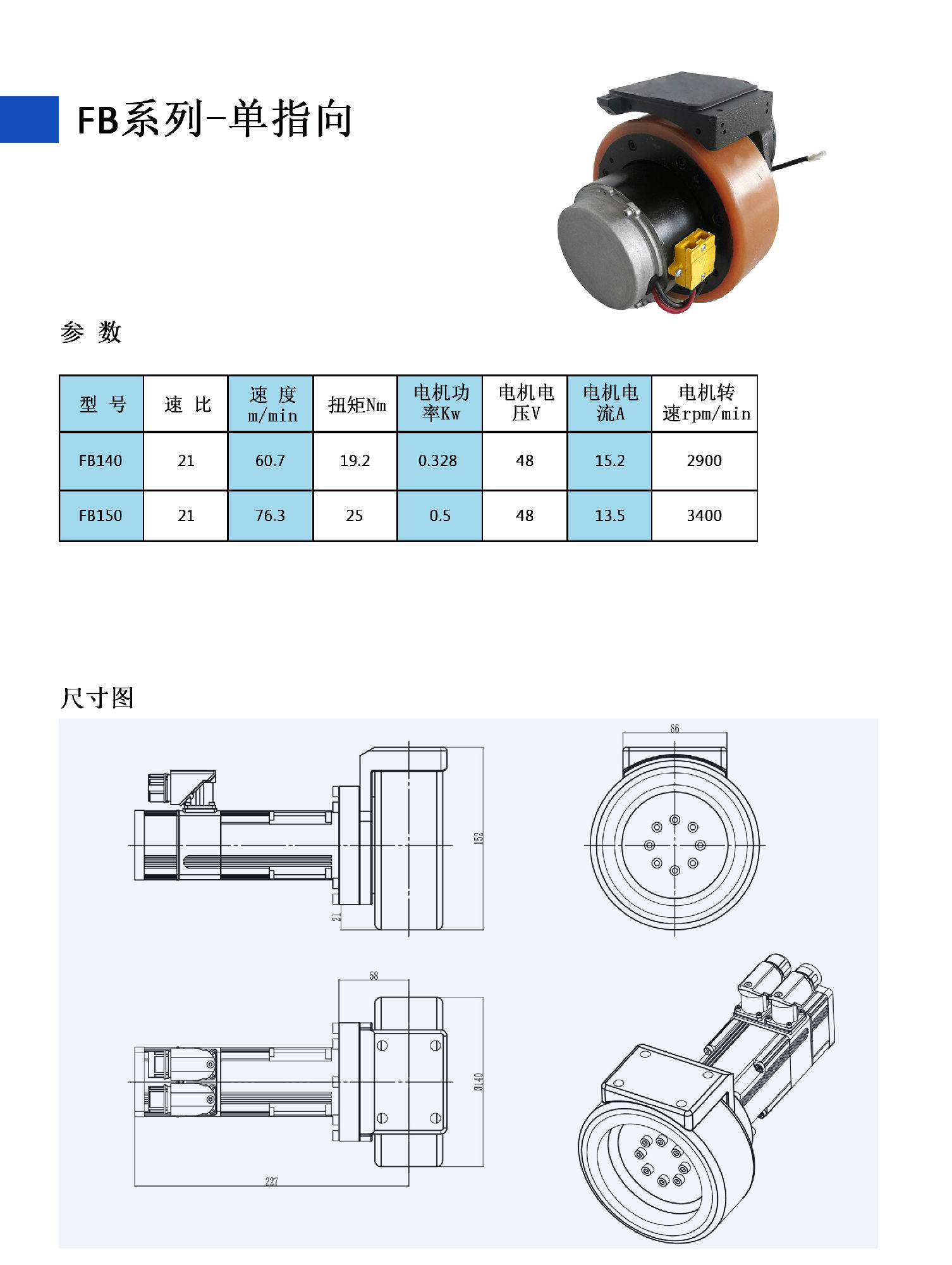 FB系列舵輪組,單指向型。差速驅(qū)動(dòng)輪組模塊,在原有舵輪組的基礎(chǔ)上,進(jìn)行深度設(shè)計(jì),將減速機(jī)和驅(qū)動(dòng)輪設(shè)計(jì)一體化,加外接直流電機(jī),成為高度集成的機(jī)電一體化AGV行走驅(qū)動(dòng)輪組組件。