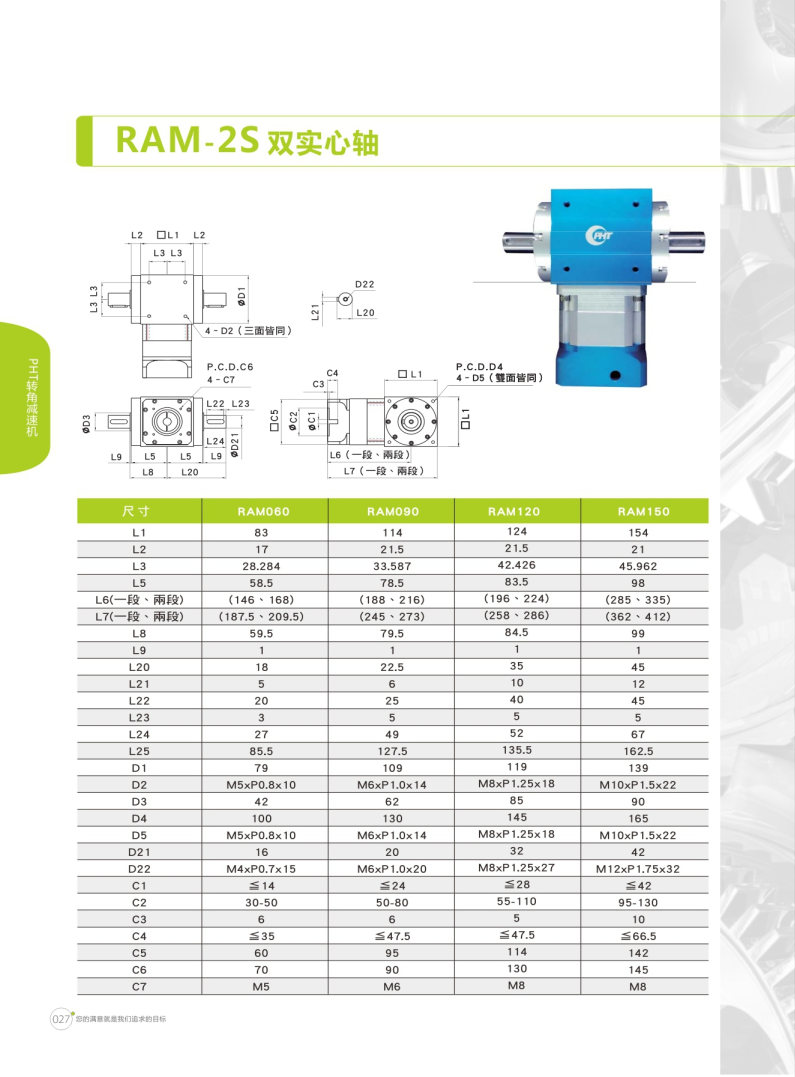 PHT(品宏行星減速機) RAM-2S系列是雙實心軸設計。 鋁合金材質可提高散熱能力,減緩溫升現象造成影響。 多樣化的出力軸可因應各種場合,客制化的入力端可搭配各式馬達。 提供各式特色之減速機,供使用者依需求選購。 特殊油封設計,正常使用下不需保養(yǎng)亦不用更換潤滑油,可延長使用壽命。 各式特色,體積小,省空間,噪音低,輸出扭矩高,安裝容易,可搭配馬達型號廣泛。 RAM搭配DM,一體成型的齒輪組,可有效的減低噪音。 RAM搭配DH,最佳的性價比,可廣泛應用于各種場合。