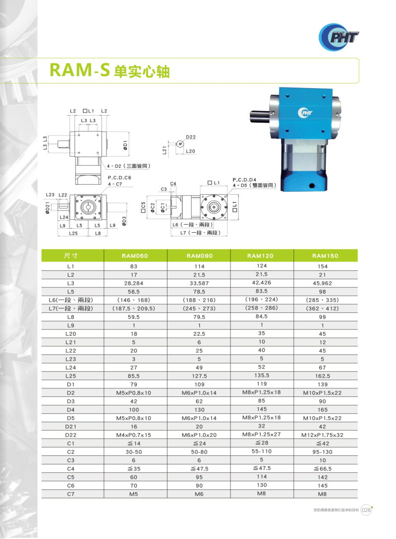 RAM-S系列是單實(shí)心軸設(shè)計(jì)。 鋁合金材質(zhì)可提高散熱能力,減緩溫升現(xiàn)象造成影響。 多樣化的出力軸可因應(yīng)各種場(chǎng)合,客制化的入力端可搭配各式馬達(dá)。 提供各式特色之減速機(jī),供使用者依需求選購(gòu)。 特殊油封設(shè)計(jì),正常使用下不需保養(yǎng)亦不用更換潤(rùn)滑油,可延長(zhǎng)使用壽命。 各式特色,體積小,省空間,噪音低,輸出扭矩高,安裝容易,可搭配馬達(dá)型號(hào)廣泛。 RAM搭配DM,一體成型的齒輪組,可有效的減低噪音。 RAM搭配DH,最佳的性價(jià)比,可廣泛應(yīng)用于各種場(chǎng)合。